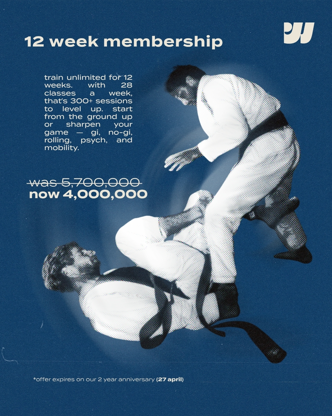 train unlimited for 12 weeks. with 28 classes a week, that's 300+ sessions to level up. start from the ground up or sharpen your game - gi, no gi, rolling, psych, and mobility.